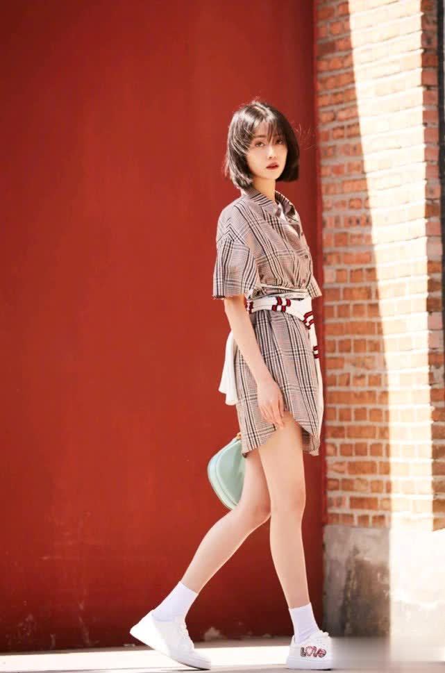 最后这套服装是一件中长款的格纹连衣裙,打破了纯色的单调,更显时尚元素。小白鞋+白色袜子,简单大方,秀出了修长的小细腿,女孩看了都羡慕吧?